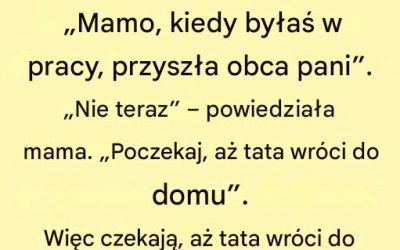 Dziewczynka siedząca przy stole niewinnie bawi się łyżeczką, pojedyncza na mamę. „Mamo, kiedy byłeś w pracy, do domu przyszła obca…
