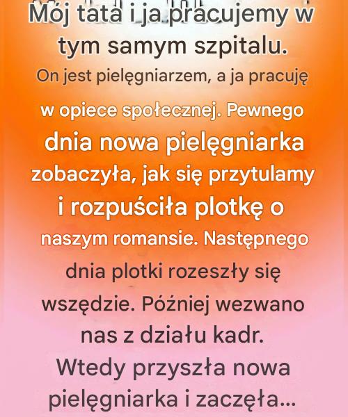 W porze lunchu nawet koledzy, którzy pracowali z moim następnym od lat, wydając się niepewni, jak się z nami charakterystyczć. Całkowicie unikali kontaktu. Inni uśmiechli się wymuszonym uśmiechem, który pojawia się cięższy niż jawna wrogość. Ani ojciec, ani ja nie rozumieliśmy, co się dzieje, gdy nasza przełożona nie poprosiła nas o spotkanie. Siedząc w jej gabinecie, słuchaliśmy w oszołomionym milczeniu, jak wyjaśniła, że krążą plotki o nieprofesjonalnym zachowaniu dwóch pracowników. Kiedy stało się jasne, że do mojego wystąpienia, niedowierzanie ustąpiło miejsca ostremu, przytłaczającemu uczuciu.