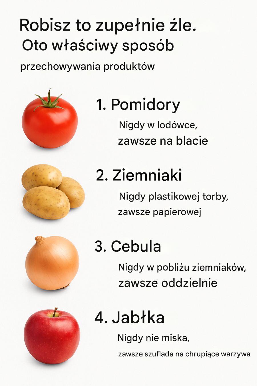 Pomidory to jeden z najczęściej źle rozumianych produktów, jeśli chodzi o przechowywanie. Wiele osób instynktownie umieszcza je w lodówce, myśląc, że przedłuży to ich świeżość. Jednak chłodzenie może spowodować utratę smaku pomidorów i nadanie im mączystej konsystencji. Zamiast tego przechowuj pomidory na blacie kuchennym, najlepiej w jednej warstwie, aby zapobiec powstawaniu siniaków.